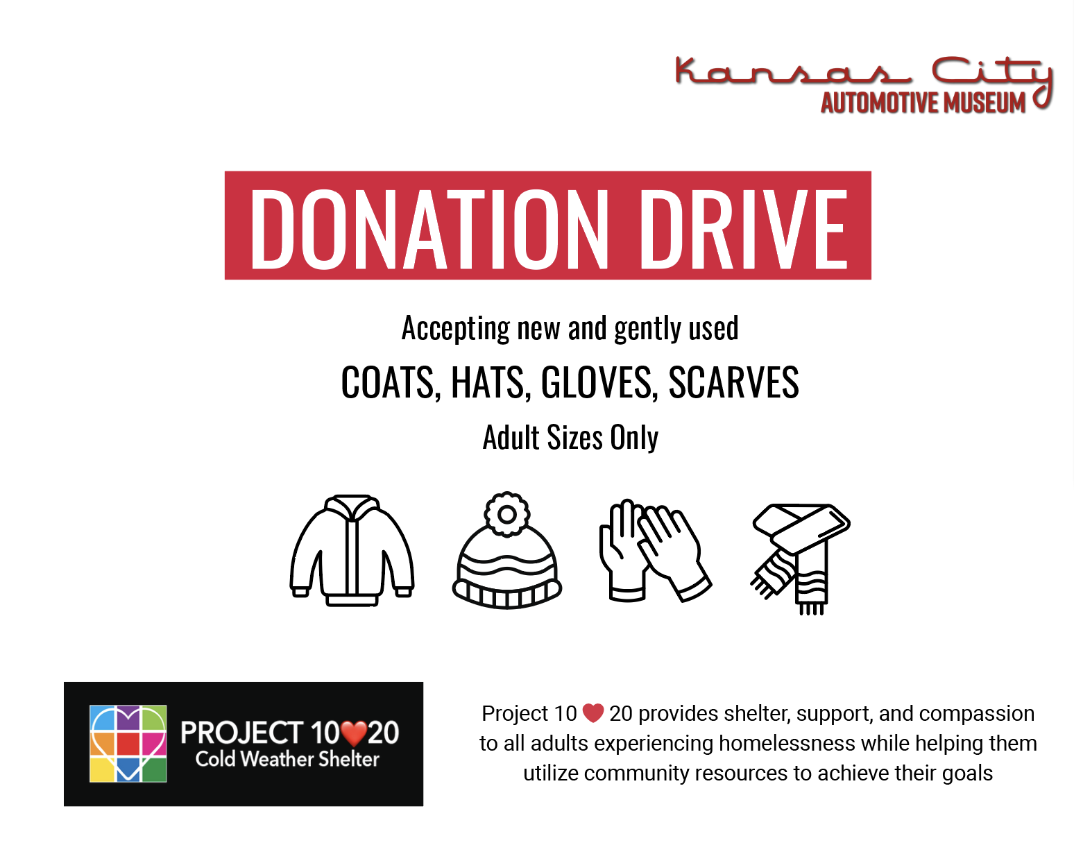 The Kansas City Automotive Museum will be collecting donations for new and gently used winter clothing to support Project 10 ❤ 20, a Johnson County-based shelter for adults.